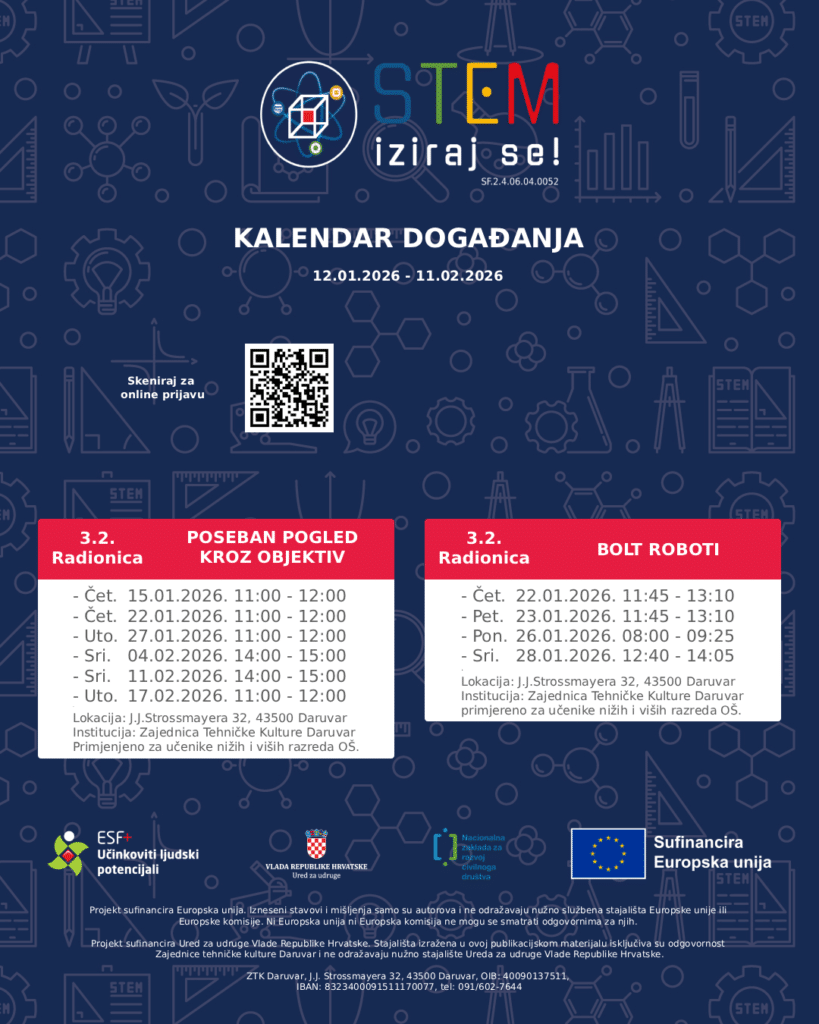 Pozivamo vas da se pridružite našim edukativnim STEM radionicama koje će se održavati od 12. Siječnja do 11. veljače. Radionice su namijenjene djeci vrtićke dobi, kao i učenicima osnovnih i srednjih škola. Kroz zanimljive i praktične aktivnosti sudionici će imati priliku istražiti svijet znanosti, tehnologije, inženjerstva i matematike. Sudjelovanje na radionicama je besplatno.