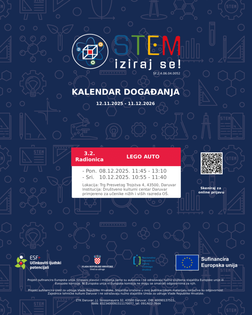 Pozivamo vas da se pridružite našim edukativnim STEM radionicama koje će se održavati od 12. studenog do 11. prosinca. Radionice su namijenjene djeci vrtićke dobi, kao i učenicima osnovnih i srednjih škola. Kroz zanimljive i praktične aktivnosti sudionici će imati priliku istražiti svijet znanosti, tehnologije, inženjerstva i matematike. Sudjelovanje na radionicama je besplatno.