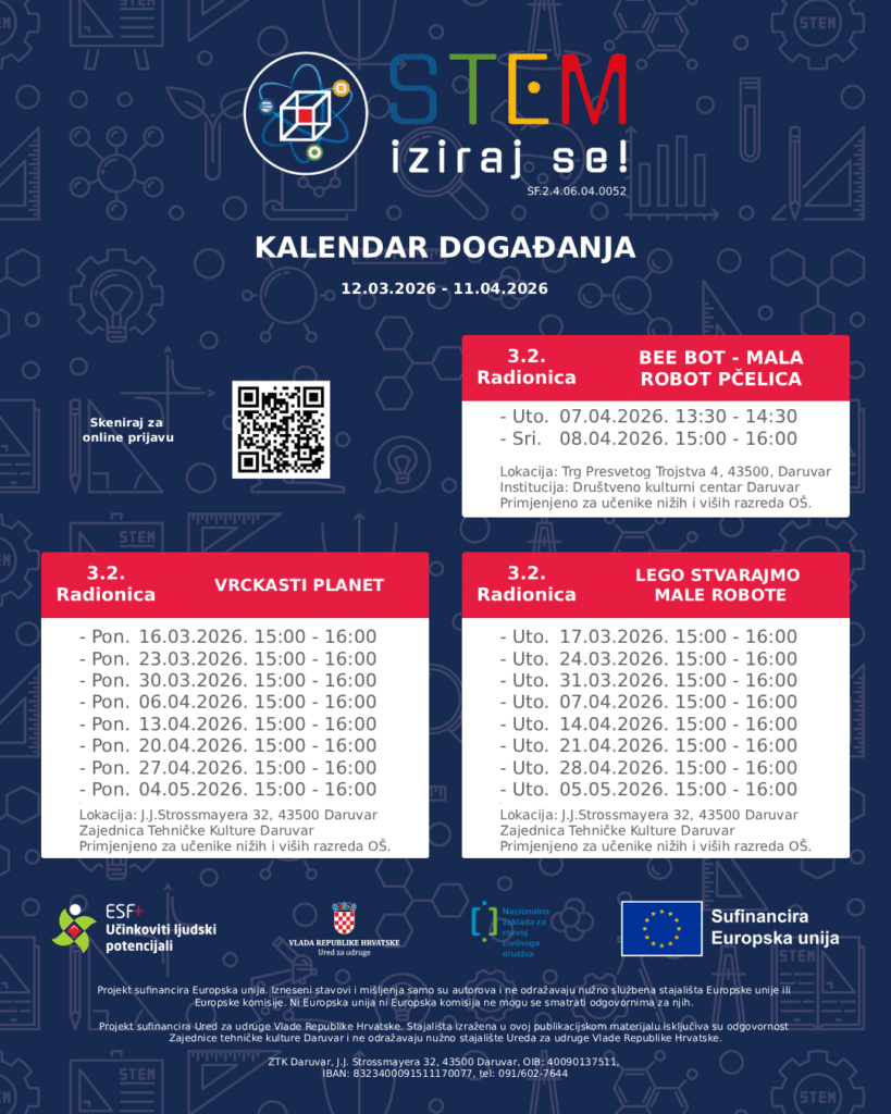 Pozivamo vas da se pridružite našim edukativnim STEM radionicama koje će se održavati od 12. veljače do 11. ožujka. Radionice su namijenjene djeci vrtićke dobi, kao i učenicima osnovnih i srednjih škola. Kroz zanimljive i praktične aktivnosti sudionici će imati priliku istražiti svijet znanosti, tehnologije, inženjerstva i matematike. Sudjelovanje na radionicama je besplatno.