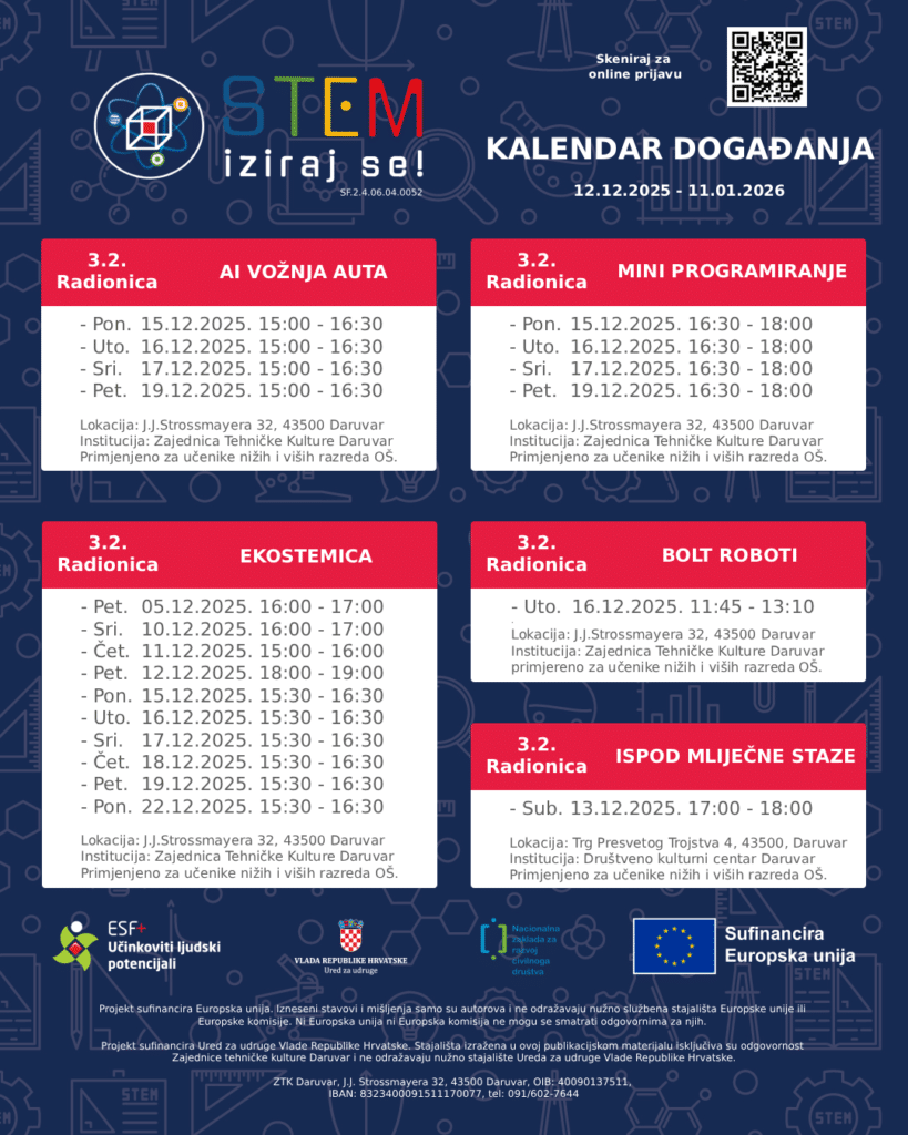 Pozivamo vas da se pridružite našim edukativnim STEM radionicama koje će se održavati od 12. prosinca do 11. siječnja. Radionice su namijenjene djeci vrtićke dobi, kao i učenicima osnovnih i srednjih škola. Kroz zanimljive i praktične aktivnosti sudionici će imati priliku istražiti svijet znanosti, tehnologije, inženjerstva i matematike. Sudjelovanje na radionicama je besplatno.